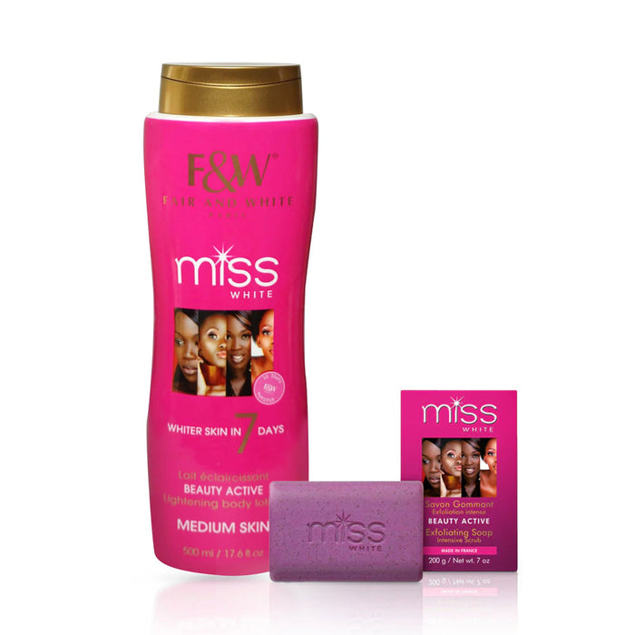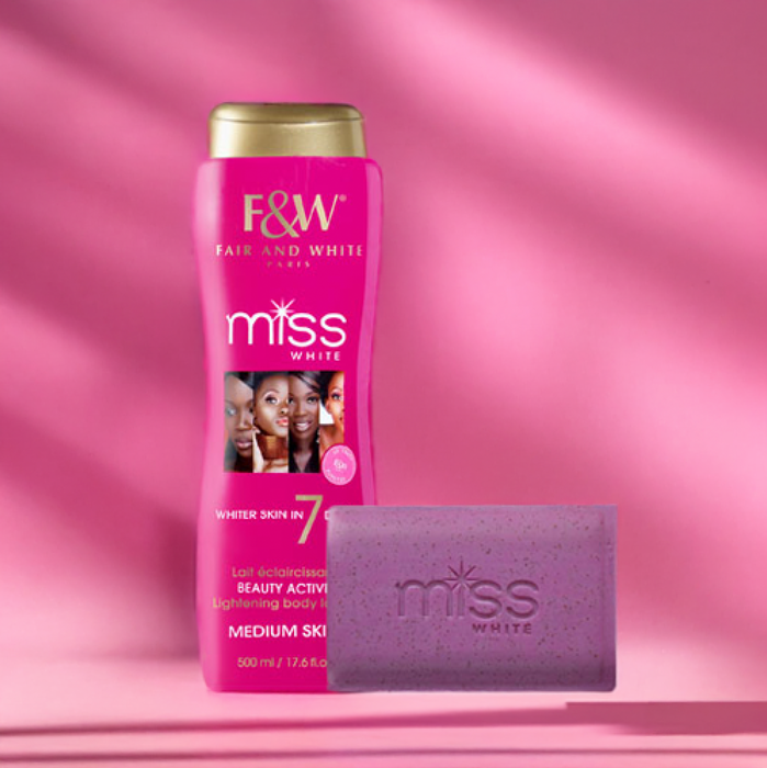 Exfoliating Soap – Intense Scrub: Start with the Miss White Exfoliating Soap or Exfoliating Shower Gel. Known as the secret to beautifully lightened skin, this soap cleanses and exfoliates, preparing skin to absorb other products more effectively. Its fine, scented foam leaves skin smooth, soft, and intensely cleansed. Frequency: Exfoliate at night, twice a week, with 3-4 days in between sessions to avoid over-exfoliation.