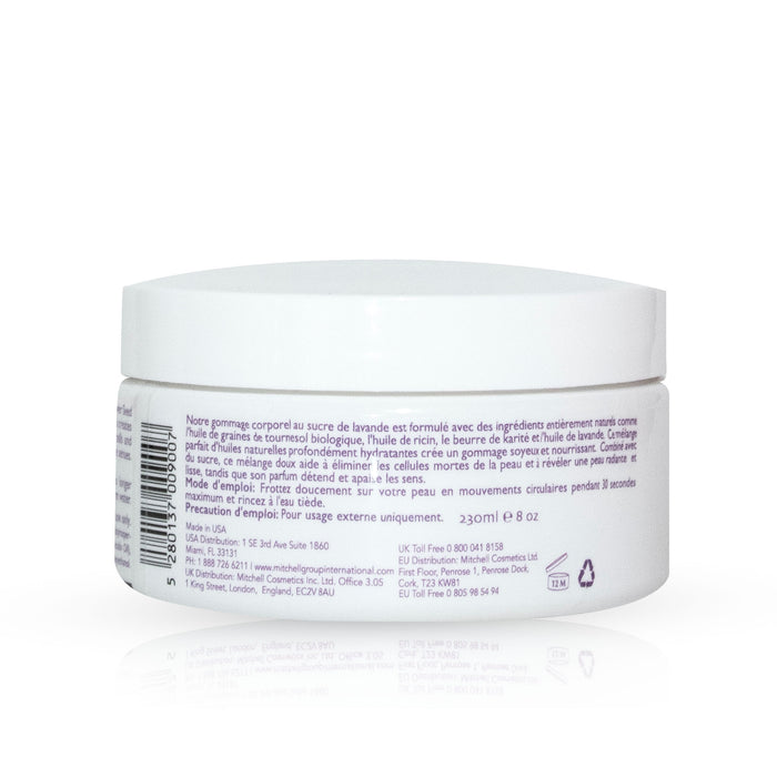 The body scrub works by combining the exfoliating properties of natural scrub particles with the soothing essence of organic lavender extract. It effectively removes dead skin cells, promoting skin renewal and a refreshed feeling.